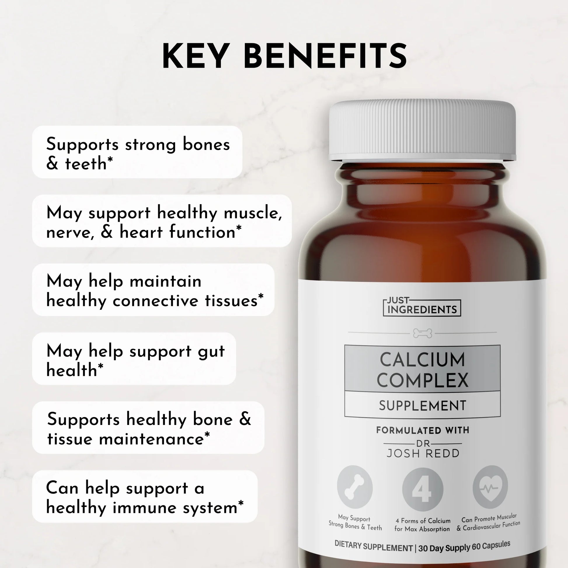 Bone support that goes beyond calcium. With four forms of calcium to help boost absorption and support bone density, plus added vitamin D3 and K2 to guide calcium where it’s needed—bones. Vitamin C, boron, L-lysine, and inulin help support collagen formation, calcium absorption, and gut health. Calcium Complex is more than bone deep. It not only helps support bone health but may also support your joints, heart, and immune system.*