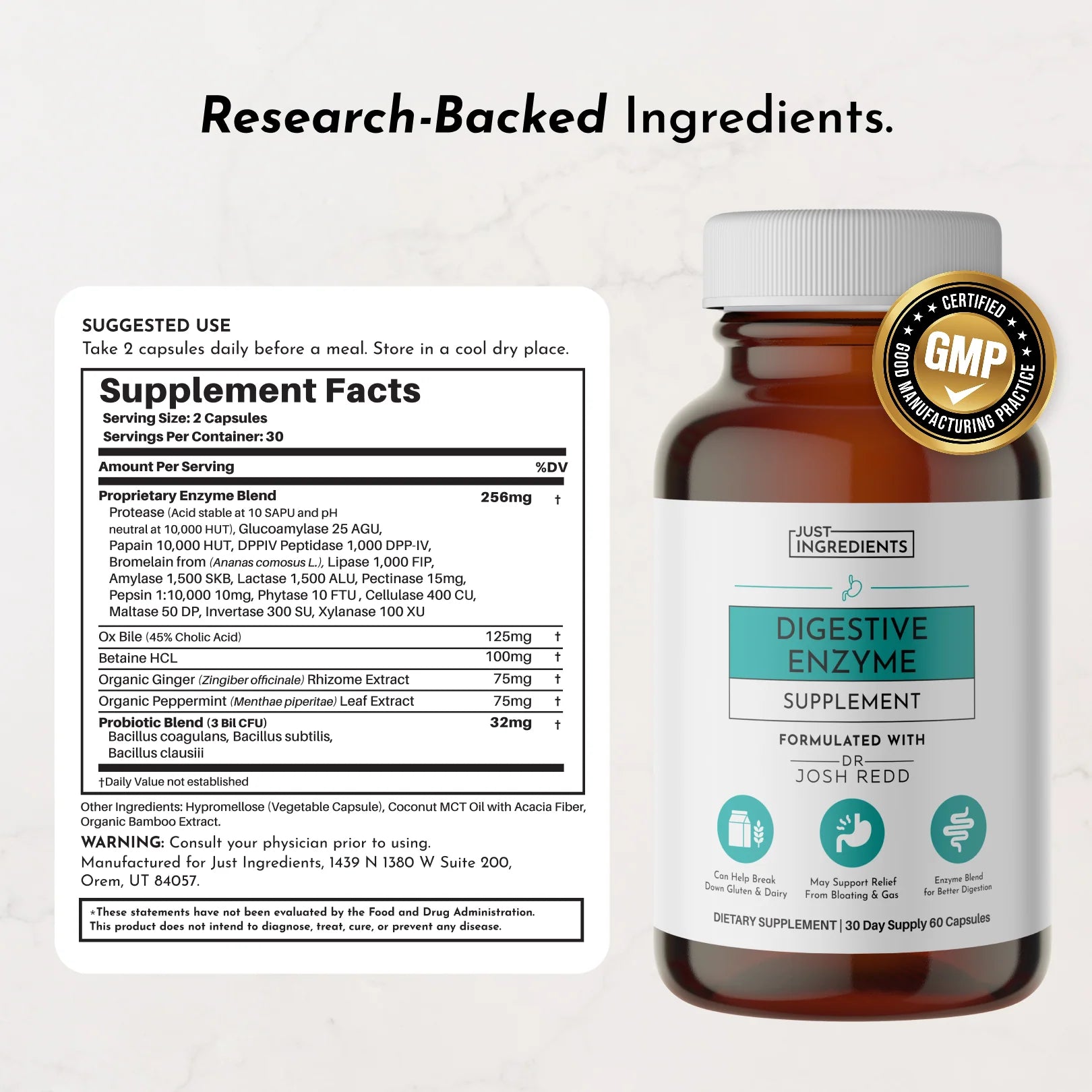 Support healthy digestion with our 15-enzyme blend, designed to help break down proteins (including gluten), fats, carbohydrates (including lactose), and fiber. Added ox bile may support fat digestion and the absorption of fat-soluble vitamins, while betaine HCl may help maintain healthy stomach acid levels. Organic ginger and peppermint extracts provide gentle digestive comfort and may help ease occasional nausea, bloating, and gas. Plus, our 3 billion CFU probiotic blend may help support a balanced gut microbiome for overall digestive wellness.*