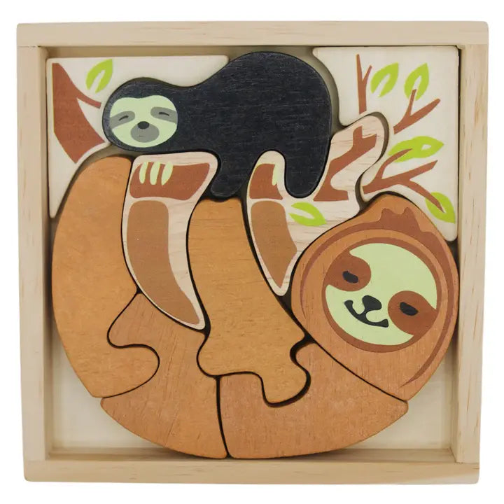 The Sloth Family Puzzle is a great gift for animal loving kids! Everyone loves sloths, and this puzzle is sure to please. Kids will love this puzzle featuring a sloth parent and child. This beautifully crafted toy offers challenging puzzle and creative storytelling play. This 6”x6” travel sized puzzle features sustainably harvested rubberwood and is finished with non-toxic, child-safe water based stains. Recommended for ages 2+.